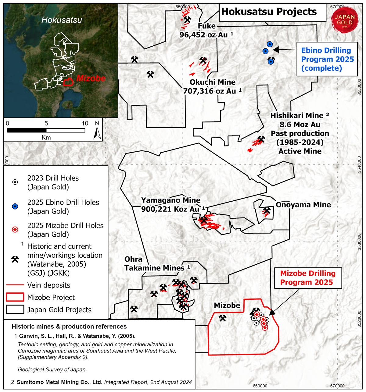 The Mizobe Project lies within the Hokusatsu Region of southern Kyushu, along the western edge of the Kagoshima Graben in a similar geological setting as the Hishikari Mine, located 23 km to the north. Hishikari is one of the highest-grade Tier 1 gold mines in the world. The Hishikari Mine produced approximately 9 million ounces of gold (8.6 Moz Au past production 1985-2024, 4.98 Moz Au reserves) at +20 g/t Au and is Japan’s only gold mine that is still operating today (Source: Sumitomo Metal Mining Co., LTD. Integrated Report, 2nd August 2024).