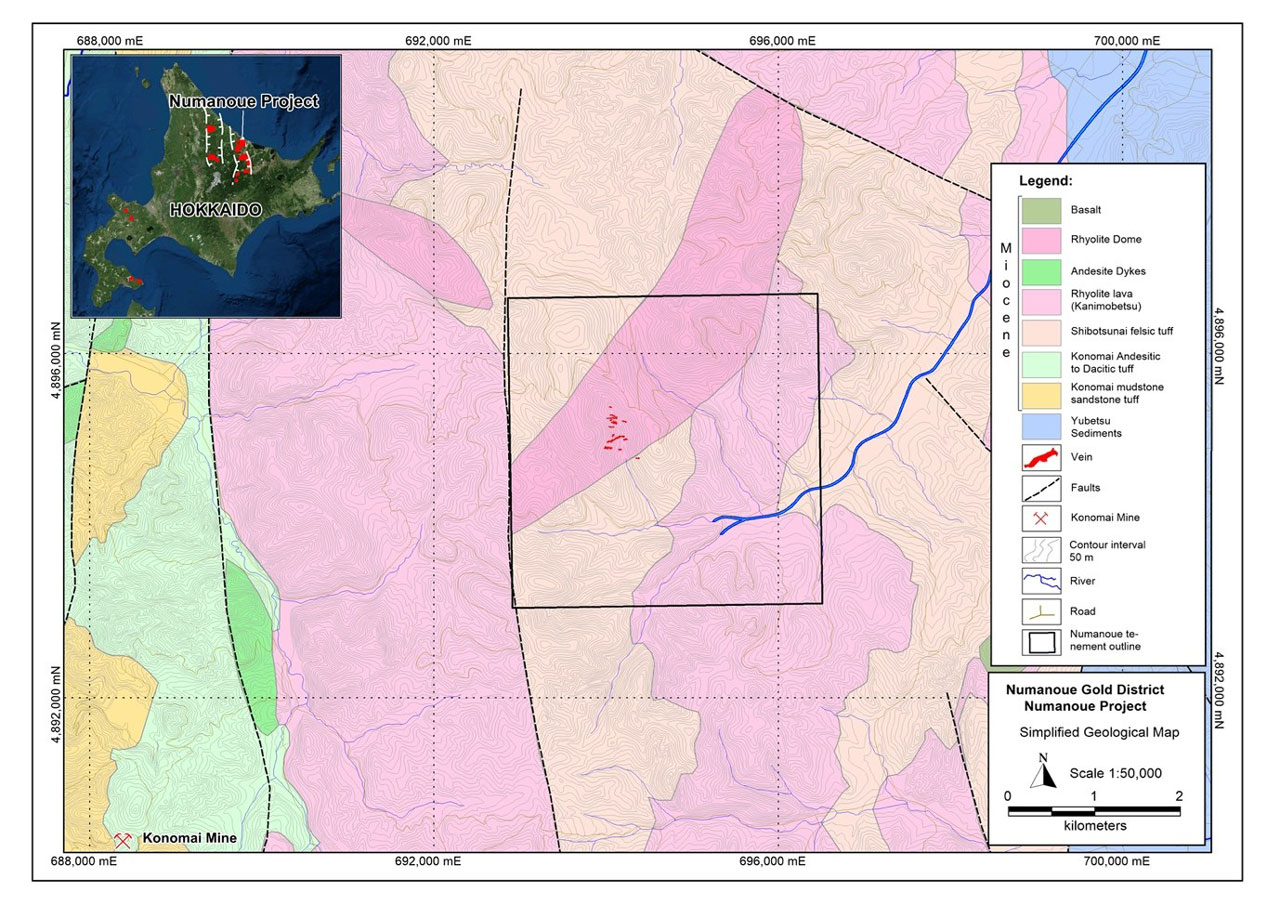 The Numanoue Project is located seven kilometers northeast of the Konomai gold-silver District and is inferred to represent an en-echelon extension to the vein systems located in the northern half of the Konomai field. The historic Numanoue mine (1923-59), which produced 35,365 ounces of gold and 2.6 million ounces of silver at an average grade of 8.0g/t gold and 815g/t silver6, is located in the middle of the Numanoue Project area hosted within an elongate, northeast-trending rhyolite intrusion, 5 by 1km in dimension, refer to Figure 6.