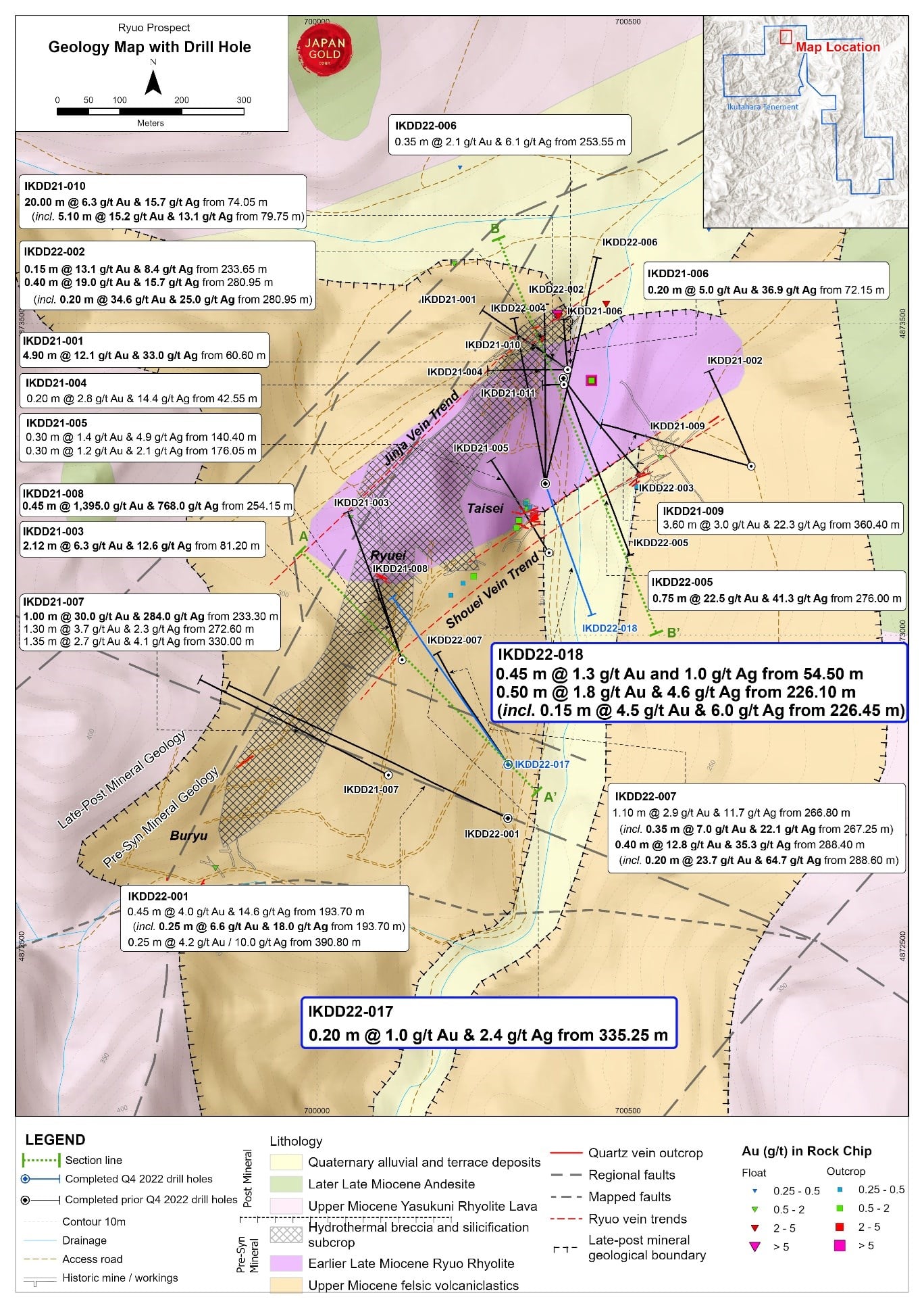 Vancouver, British Columbia--(Newsfile Corp. - February 24, 2023) - Japan Gold Corp. (TSXV: JG) (OTCQB: JGLDF) (the "Company") is pleased to announce additional results from work programs completed in the fourth quarter of 2022 over the Ryuo prospect within the Ikutahara Project, northern Hokkaido. Work programs included two drill holes completed in December, mapping of prospect extensions, and completion of an extensive soil geochemical survey covering 1,300 hectares over the prospect area and potential mineralized extensions. The Ryuo prospect is one of several prospects being advanced within the Company's 100% owned Ikutahara Project, (Figure 1).
