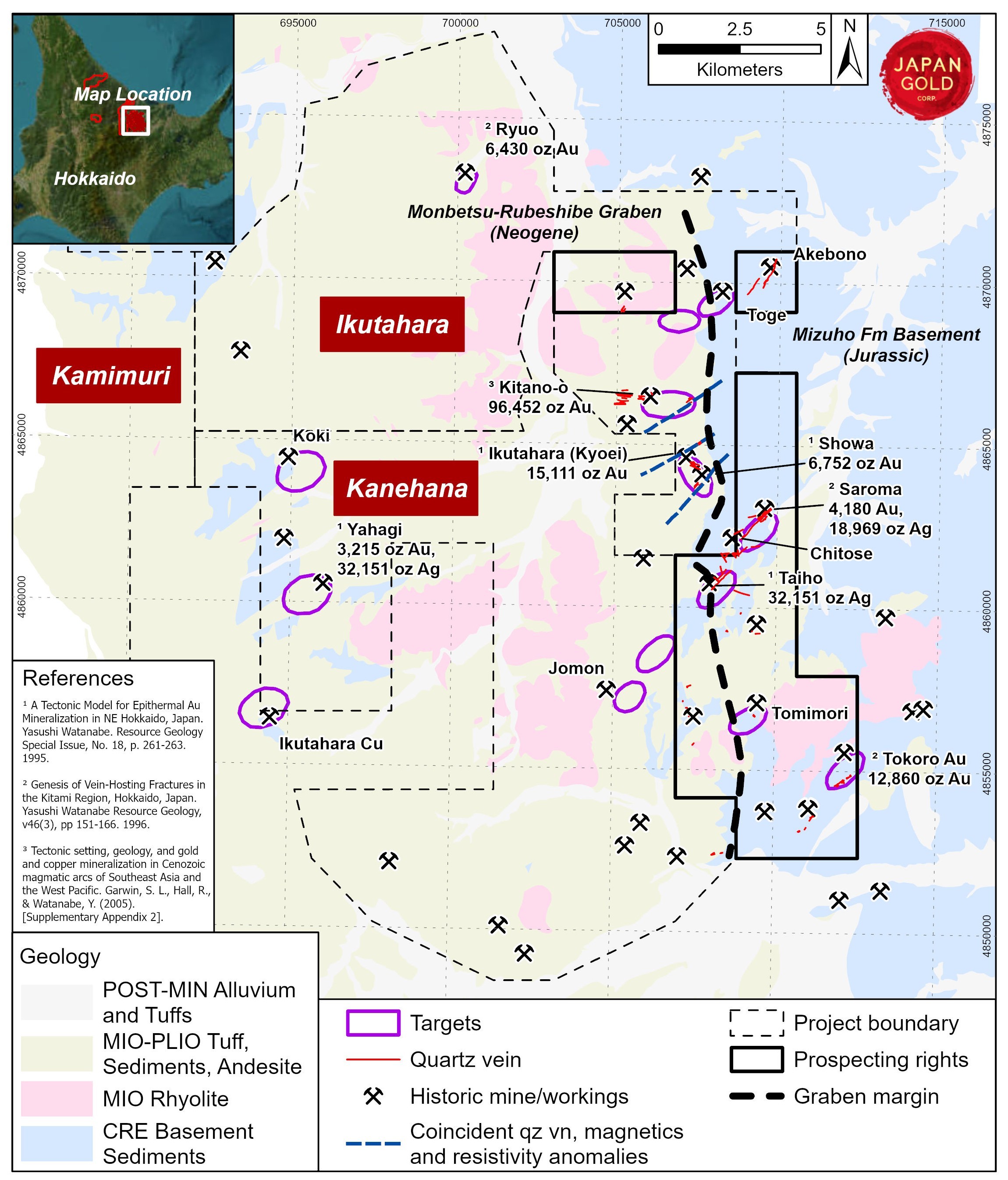 The Ikutahara Project contains up to 30 small historic mines and workings associated with epithermal veins, sinters and steam heated alteration. Japan Gold has identified a number of exploration targets. The key targets are the Kitano-O District prospect, the Saroma-Jomon corridor and the Ryuo prospect.