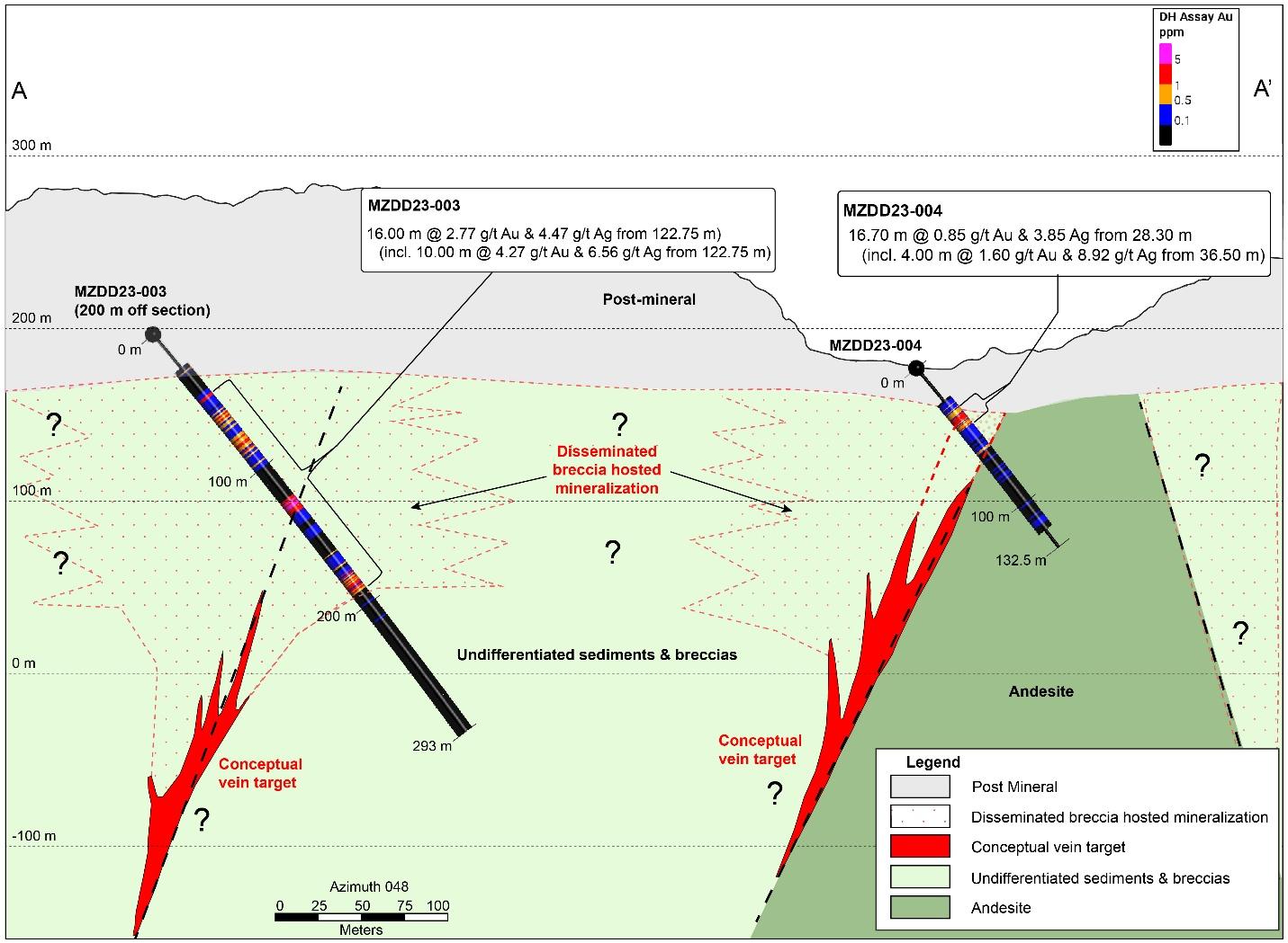 - 10.0m @ 4.27g/t Au from 122.75m (MZDD23-003) and