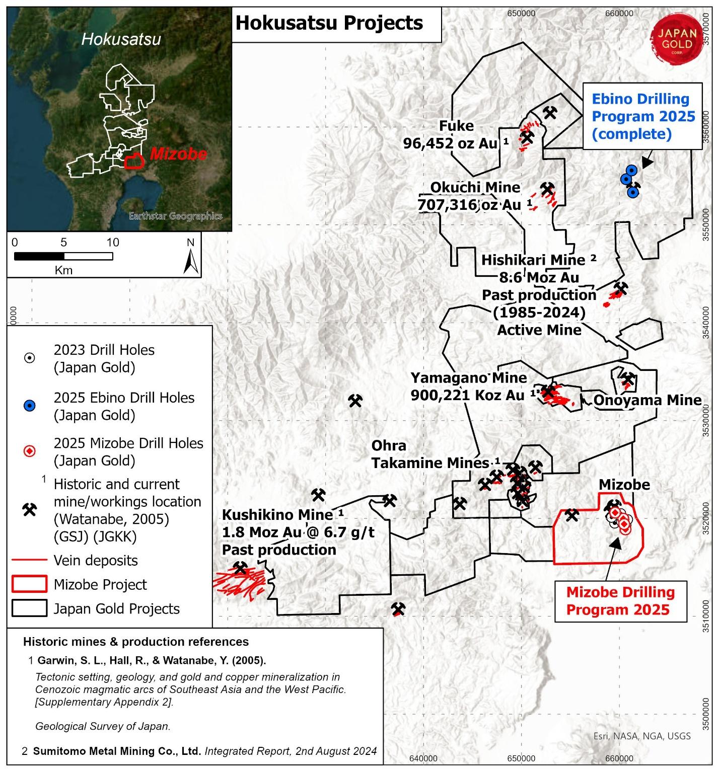 The Mizobe Project lies within the Hokusatsu Region of southern Kyushu, along the western edge of the Kagoshima Graben in a similar geological setting as the Hishikari Mine, located 23 km to the north. Hishikari is one of the highest-grade Tier 1 gold mines in the world. The Hishikari Mine produced approximately 9 million ounces of gold (8.6 Moz Au past production 1985-2024, 4.98 Moz Au reserves) at +20 g/t Au and is Japan’s only gold mine that is still operating today (Source: Sumitomo Metal Mining Co., LTD. Integrated Report, 2nd August 2024).