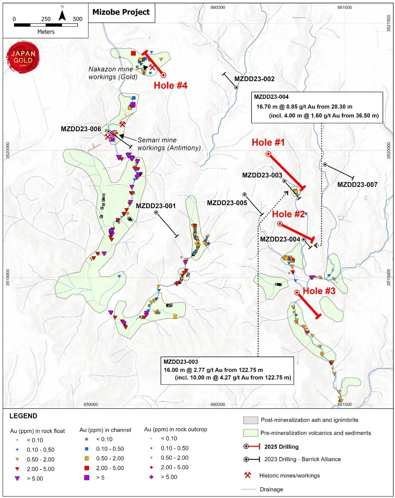 Historical mining activities within Mizobe focused on antimony-rich hydrothermal breccias at the Semari and Nakazon workings, prior to 1942. In 2000, as part of government supported regional geological surveys, the Metal Mining Agency of Japan ("MMAJ") drill hole 12MAHT-2 was drilled 1 km to the southeast of the historical antimony workings, targeting a geophysical anomaly below a mineralized outcrop grading 0.3 g/t gold. Drilling intersected a mineralized interval of 43.35 m @ 0.89 g/t gold, with an included interval of 20.3 m @ 1.16 g/t gold from 307.0 m down-hole.